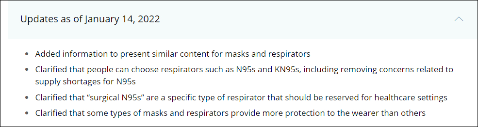 即便如此,新更新的指南依舊對各類口罩進行了詳細説明:“鬆散編織的布口罩提供最差保護;多層精細編織布口罩稍微好點;一次性醫用口罩及KN95口罩提供更好保護,受美國國家職業安全衞生研究所(NIOSH)認證的N95等口罩提供最好保護。”