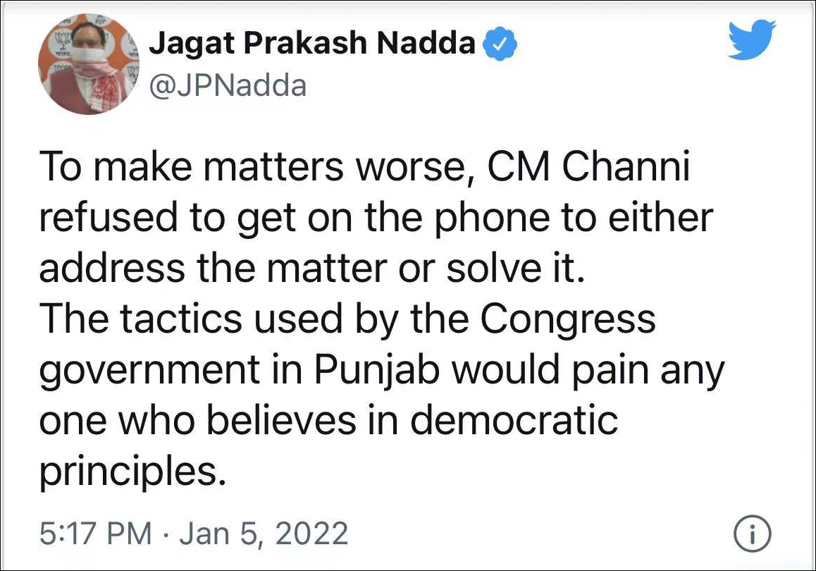 印度人民黨議員賈加特·普拉卡什·納達在其推特中表示:“國大黨政府在旁遮普使用的策略會傷害任何相信民主原則的人。”