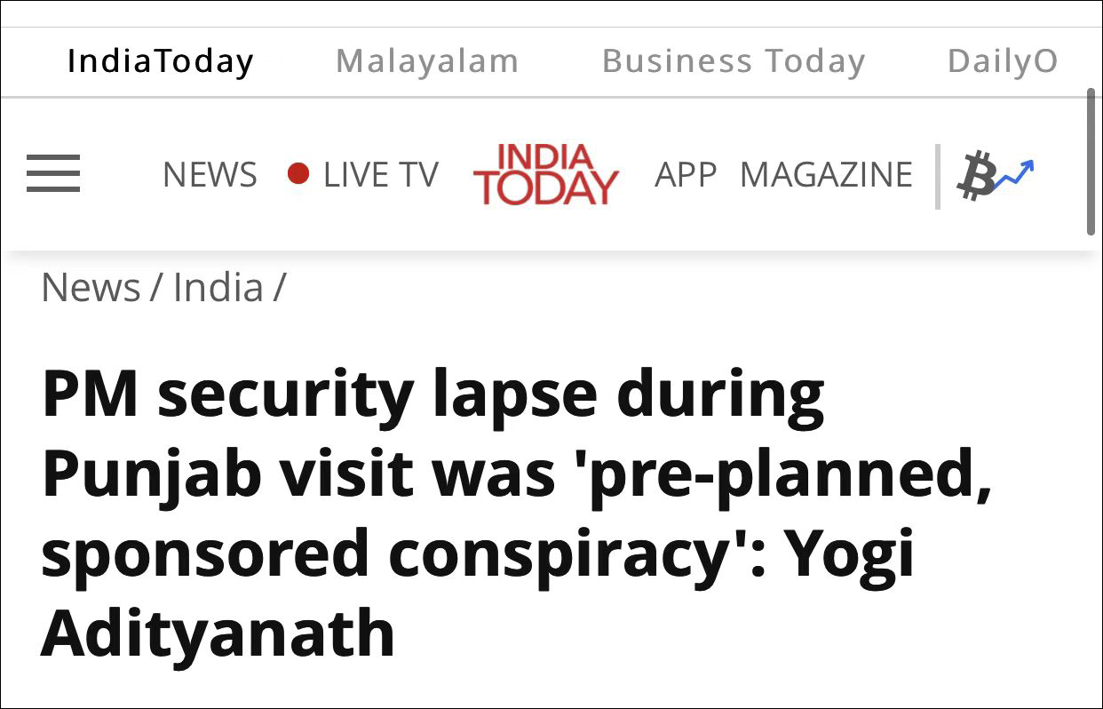 《今日印度》報道稱,莫迪5日原定乘坐直升機前往菲羅茲布爾。但由於天氣惡劣,他改為走公路。據稱,與地方政府共享情報的“特別保護小組”在計劃中提到,如果天氣不好,莫迪可能不得不通過陸路前往旁遮普邦,在這種情況下必須封閉道路。《今日印度》調查發現,在莫迪出訪當天,警方確實在交換有關抗議活動的情報,但有關路線並沒有被清理。