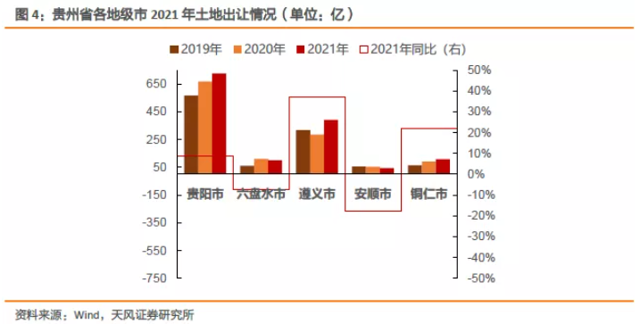 貴州省土地出讓收入集中在貴陽市、遵義市,2021年兩市土地出讓收入均同比增長,遵義市增速達37%。