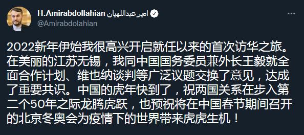 阿卜杜拉希揚14日在推特上用中文表示:“2022新年伊始我很高興開啓就任以來的首次訪華之旅。在美麗的江蘇無錫,我同中國國務委員兼外長王毅就全面合作計劃、維也納談判等廣泛議題交換了意見,達成了重要共識。中國的虎年快到了,祝兩國關係在步入第二個50年之際龍騰虎躍,也預祝將在中國春節期間召開的北京冬奧會為疫情下的世界帶來虎虎生機!”