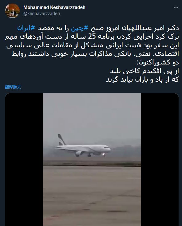 伊朗駐華大使克沙瓦爾茲扎德則在推特上表示,25年全面合作計劃的實施,是此行的重要成果之一。伊朗代表團由高級政治人士和經濟官員組成,兩國關係現在非常好。