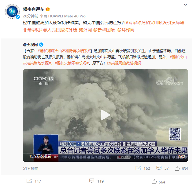據@領事直通車 16日消息,經中國駐湯加大使館初步核實,暫無中國公民傷亡報告。