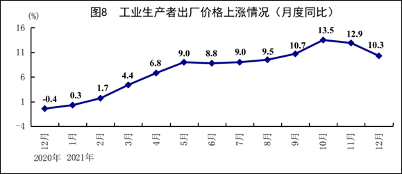 全年全國規模以上工業增加值比上年增長9.6%,兩年平均增長6.1%。分三大門類看,採礦業增加值增長5.3%,製造業增長9.8%,電力、熱力、燃氣及水生產和供應業增長11.4%。高技術製造業、裝備製造業增加值分別增長18.2%、12.9%,增速分別比規模以上工業快8.6、3.3個百分點。分產品看,新能源汽車、工業機器人、集成電路、微型計算機設備產量分別增長145.6%、44.9%、33.3%、22.3%。分經濟類型看,國有控股企業增加值增長8.0%;股份制企業增長9.8%,外商及港澳台商投資企業增長8.9%;私營企業增長10.2%。12月份,規模以上工業增加值同比增長4.3%,環比增長0.42%。製造業採購經理指數為50.3%,比上月上升0.2個百分點。2021年,全國工業產能利用率為77.5%,比上年提高3.0個百分點。