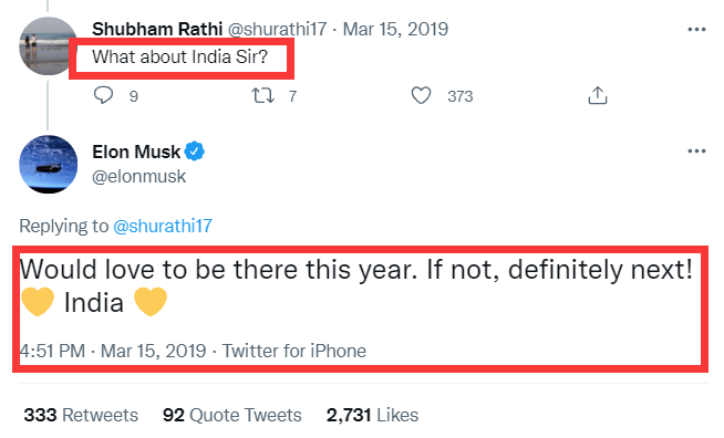 雖然印度政府用關税措施將特斯拉汽車擋在門外,但印度網友卻十分渴望特斯拉的到來。2019年,馬斯克在回應推特網友提問時表示,“今年很想去印度。如果不能,肯定是明年!”