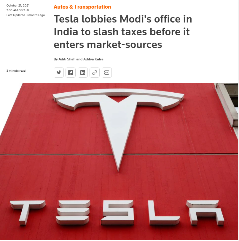 有所謂消息人士稱,印度重工業部主要擔心的是其他公司可能會尋求類似的讓步。一位印度官員表示,目前,該國沒有向在印度設廠的其他汽車製造商提供任何特殊優惠。如果把特斯拉視為特例,在進口關税方面做出讓步,對已經進行鉅額投資的現有企業是不公平的。