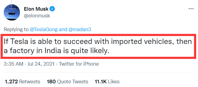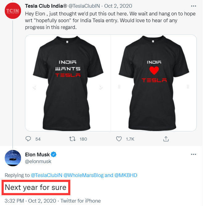 到了2020年,推特上又出現一篇建議特斯拉到印度投資的貼文,該貼文附帶有一個T恤衫圖片,上面寫着一行字:“印度想要特斯拉”。馬斯克當時針對該貼文回覆道,“明年是肯定的,謝謝你的等待”。