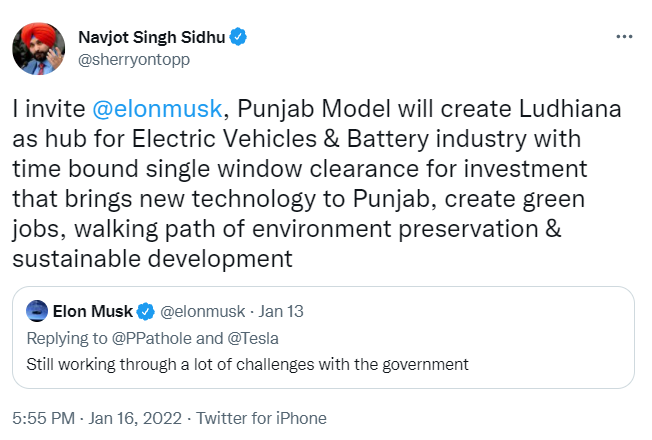 我向馬斯克發出邀請,旁遮普邦模式將把盧迪亞納打造為電動汽車和電池行業的中心,在約定時間內為投資者提供一站式許可,也有助於為旁遮普邦帶來新技術,創造綠色就業機會,走環境保護和可持續發展的道路。