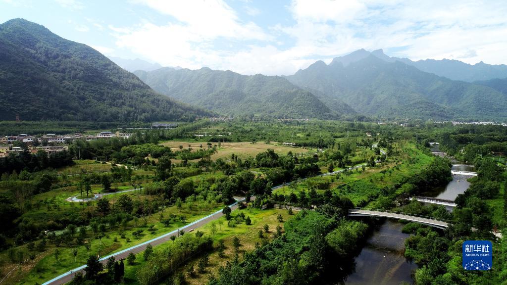 陝西省西安市長安區秦嶺違建別墅“羣賢別業”拆除後建設的秦嶺和諧森林公園(2019年7月26日攝,無人機照片)。新華社記者 劉瀟 攝