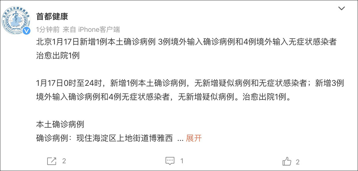 確診病例:**現住海淀區上地街道博雅西園,為1月15日通報的本土確診病例的密切接觸者。**1月15日轉至集中隔離點,1月17日核酸檢測結果為陽性,已轉至定點醫院隔離治療,綜合流行病史、臨牀表現、實驗室檢測和影像學檢查等結果,當日診斷為確診病例,臨牀分型為輕型。