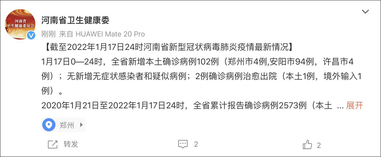 據微博@河南省衞生健康委1月18日消息,1月17日0—24時,全省新增本土確診病例102例(鄭州市4例,安陽市94例,許昌市4例);無新增無症狀感染者和疑似病例;2例確診病例治癒出院(本土1例,境外輸入1例)。