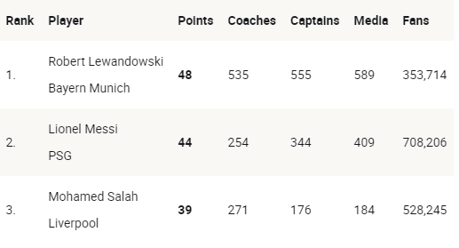 拜仁慕尼黑前鋒羅伯特·萊萬多夫斯基以48分力壓梅西(44),最終獲得了該獎項,以表彰他在2021年各賽事中的傑出表現。萊萬在2021年的各賽事中總共打入69球,並有11次助攻,幫助拜仁捧起了四座冠軍獎盃。