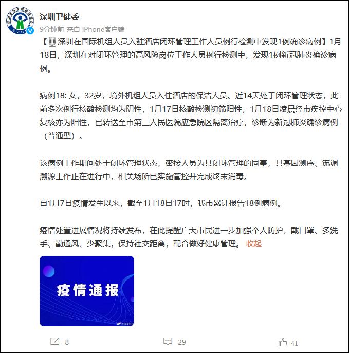 據@深圳衞健委 消息,1月18日,深圳在對閉環管理的高風險崗位工作人員例行檢測中,發現1例新冠肺炎確診病例。