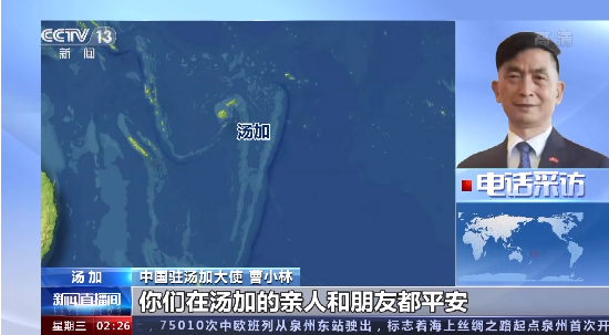 這幾天,我們使館工作人員,走訪慰問部分受災害較重的中國公民家庭,提供必要的幫助。另外,由於無法和在國內的家人取得聯繫,我們也通過合適方式向他們在中國的親人報平安。我也想通過此次採訪,向電視機前的觀眾報告,你們在湯加的親人和朋友都平安。
