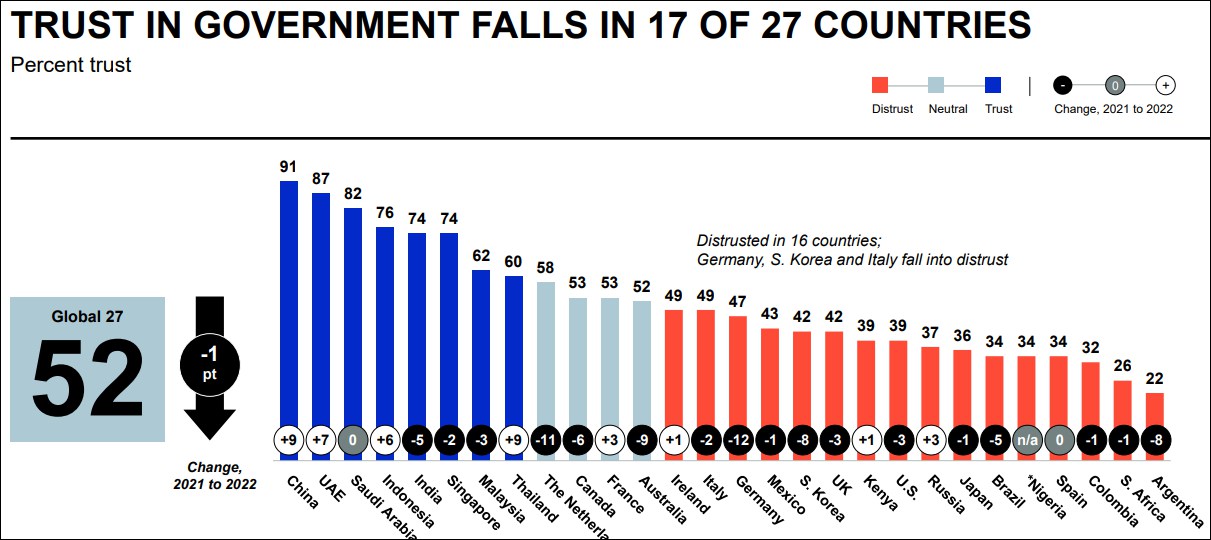 1月18日,全球最大獨立公關公司愛德曼發佈2022年度“愛德曼信任度晴雨表”報告。受訪者被要求對本國政府、企業、媒體和非政府組織(NGO)4個方面的信任度進行評價。在報告調查的28個國家當中,中國、阿聯酋、印尼、印度、沙特分列前五位,俄羅斯、日本、韓國、美國、英國分列後五位。