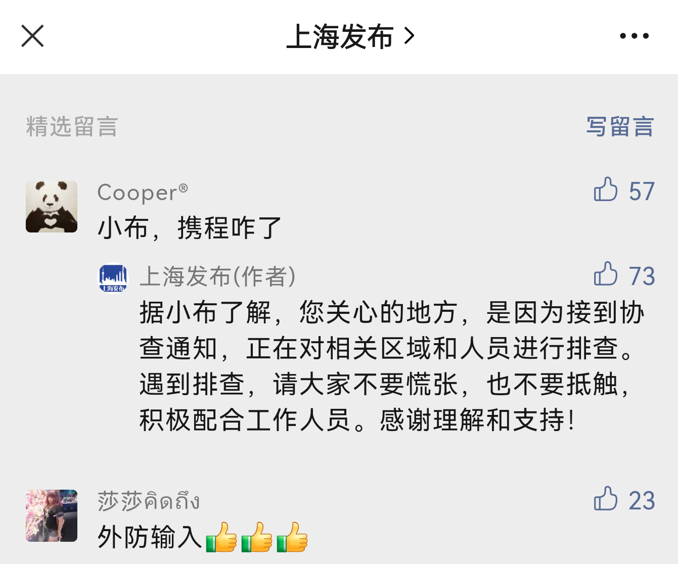 對此,上海發佈回覆稱:據小布瞭解,您關心的地方,是因為接到協查通知,正在對相關區域和人員進行排查。遇到排查,請大家不要慌張,也不要牴觸,積極配合工作人員。感謝理解和支持!