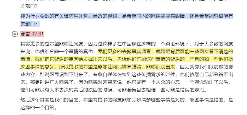 其實今天無論採訪的是誰,對方回答了什麼,他們都會天然帶着有色眼鏡看待中國。所以就算我在採訪的剛開始,就已經回答過我們是一個事實揭露類的視頻,這個賬號也是出於我個人的興趣才做的,恰恰是外媒那些不實的報道,源源不斷給我提供素材,才讓我有動力去反駁、去揭露真相。但他們依然稱我的視頻為民族主義視頻。因為只有把愛國定義為不理性的情緒和偏執的民族主義,才能夠給某些人混淆視聽、渾水摸魚的機會,然後一羣理中客就可以藉此高潮,降低中國人的愛國情緒。