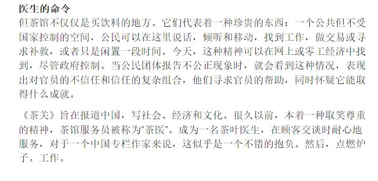 而我也是在被污衊之後才發現,這篇內容所在的專欄「chaguan」,簡直就像是一個專為反華而開的欄目,他們討論的不是中國,而是對中國的偏見。專欄的名字就是一個鮮明的證據,他們給茶館這一個休閒場所,強加了一個奇怪的定義,認為這是一處言論自由、平民鍵政的地方。但只有咱們自己知道,喝茶對中國人來説就是稀鬆平常的事兒。所以這種過度解讀,歸根究底是因為常年佔據話語權的外媒已經習慣了這種自説自話,在沒有真正理解另一方的文化,就隨便扣帽子。而這種被輕視、被曲解的感覺,在我去找作者對質時,達到了最頂峯。