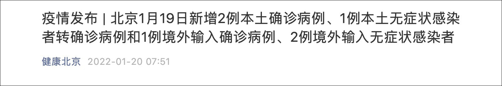 據微信公眾號“健康北京”1月20日消息, 1月19日0時至24時,新增2例本土確診病例(為昨日通報的核酸檢測陽性者)和1例無症狀感染者轉確診病例(為1月18日通報的核酸檢測陽性者),無新增疑似病例和無症狀感染者;新增1例境外輸入確診病例和2例無症狀感染者,無新增疑似病例。