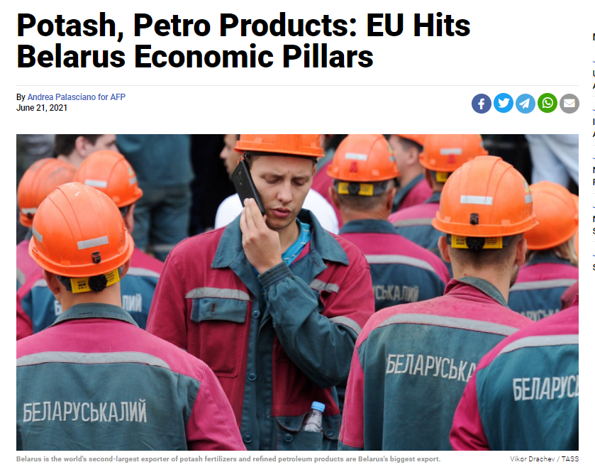 歐盟打擊白俄羅斯經濟支柱,鉀肥、石油產品等產品。來源:莫斯科時報