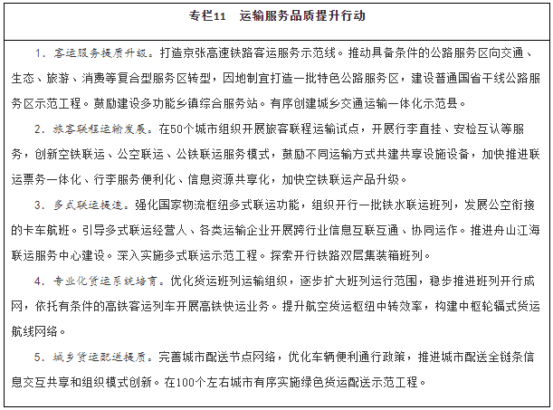運輸服務更加高效。運輸服務質量穩步提升,客運“一站式”、貨運“一單制”服務更加普及,定製化、個性化、專業化運輸服務產品更加豐富,城市交通擁堵和“停車難”問題持續緩解,農村和邊境地區運輸服務更有保障,具備條件的建制村實現快遞服務全覆蓋。面向全球的國際運輸服務網絡更加完善,中歐班列發展質量穩步提高。