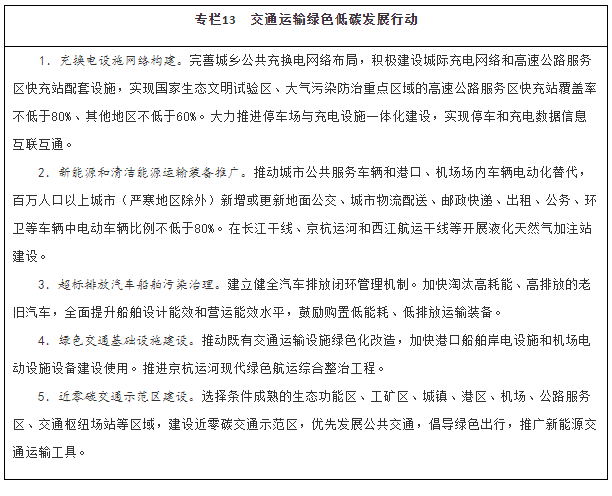 實施交通運輸綠色低碳轉型行動。研究制定交通運輸領域碳排放統計方法和核算規則,加強碳排放基礎統計核算,建立交通運輸碳排放監測平台,推動近零碳交通示範區建設。建立綠色低碳交通激勵約束機制,分類完善通行管理、停車管理等措施。