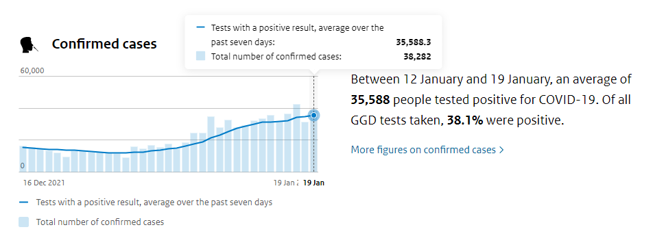 目前,荷蘭疫情仍不樂觀。據荷蘭政府官方統計數據,最近7天平均每日新增確診病例數超過35000例。荷蘭累計確診病例已經突破350萬例,累計死亡2.1萬例。霍普金斯大學(JHU)數據顯示,1月19日當天,荷蘭日新增達到創紀錄的6.9萬例。
