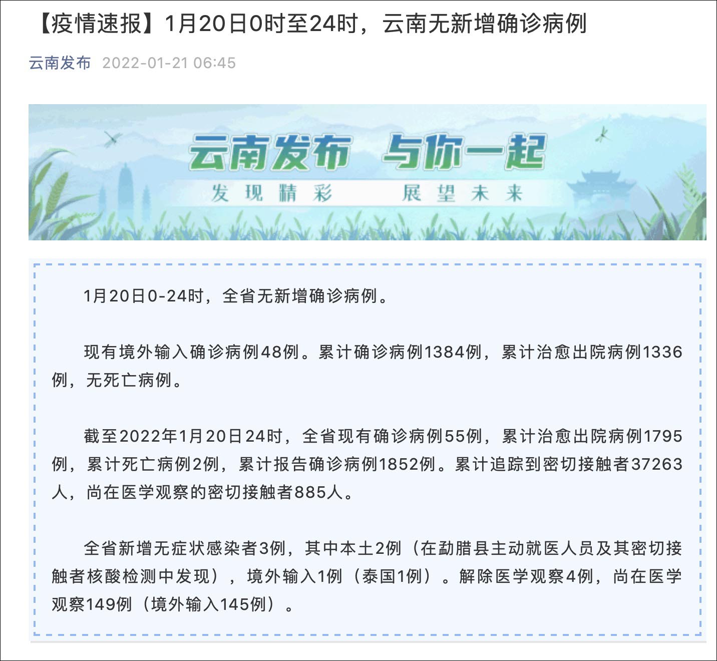 據微信公眾號“雲南發佈”1月21日消息,1月20日0-24時,全省無新增確診病例。