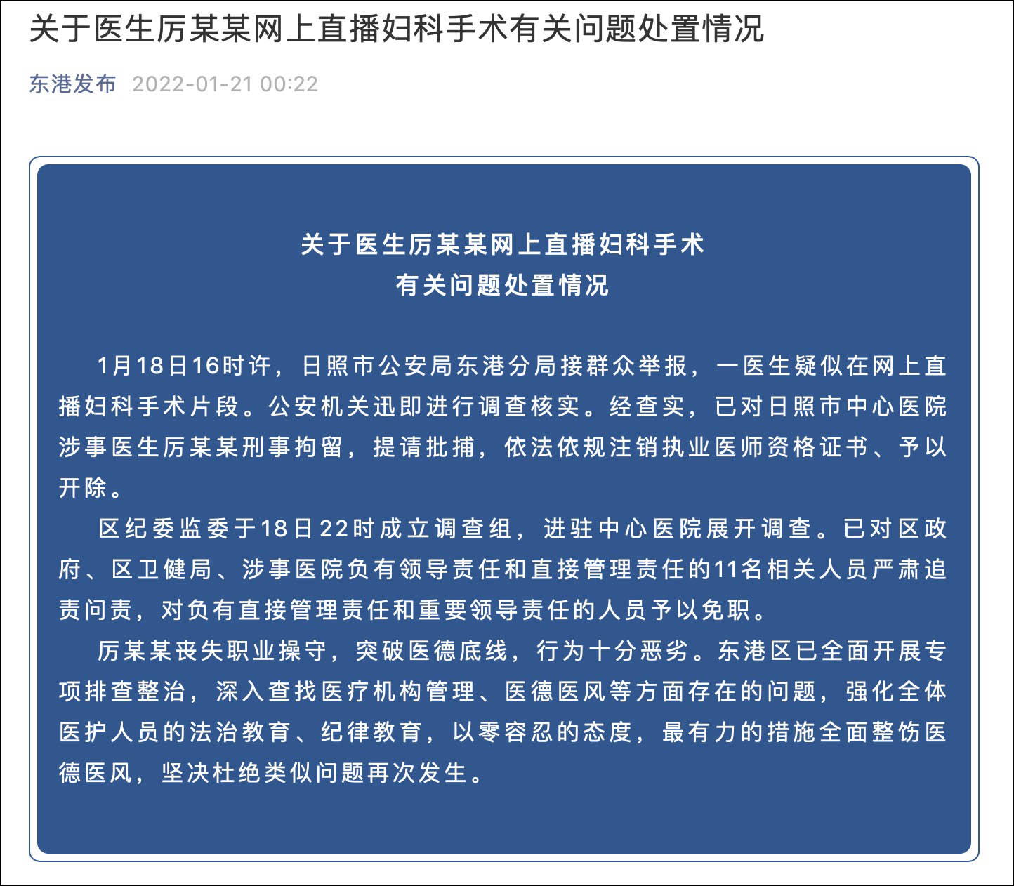 今日(1月21日),山東省日照市東港區宣傳部官方微信公眾號“東港發佈” 發佈通報稱:1月18日16時許,日照市公安局東港分局接羣眾舉報,一醫生疑似在網上直播婦科手術片段。日照市公安機關迅即進行調查核實。經查實,已對日照市中心醫院涉事醫生厲某某刑事拘留,提請批捕,依法依規註銷執業醫師資格證書、予以開除。
