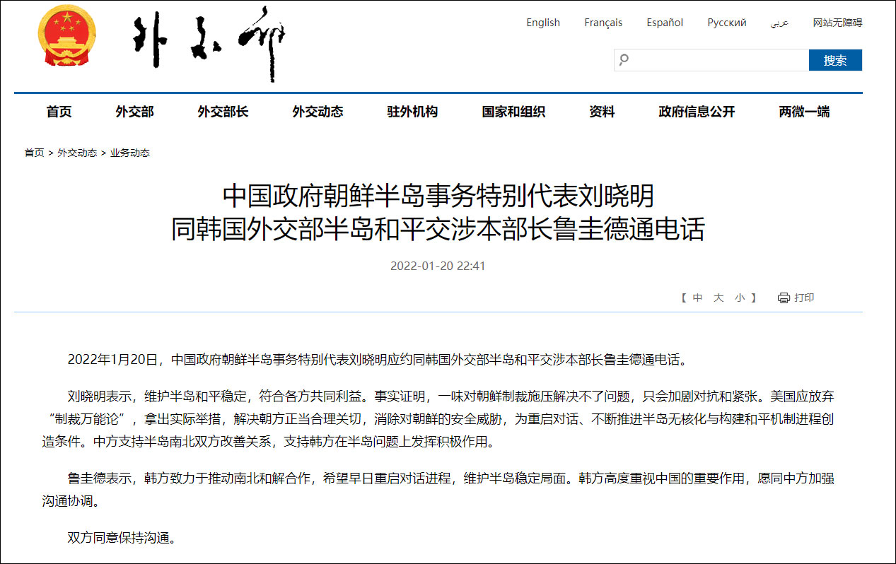 (觀察者網訊)據外交部網站1月20日消息,中國政府朝鮮半島事務特別代表劉曉明當天應約同韓國外交部半島和平交涉本部長魯圭德通電話。
