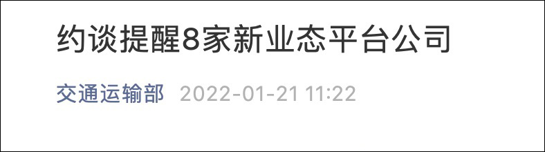 據微信公眾號“交通運輸部”1月21日消息,2022年1月20日上午,交通運輸新業態協同監管部際聯席會議辦公室對滿幫、貨拉拉、滴滴貨運、快狗打車等4家互聯網道路貨運平台公司進行約談,對滴滴出行、曹操出行、T3出行、美團出行等4家網約車平台公司進行提醒。