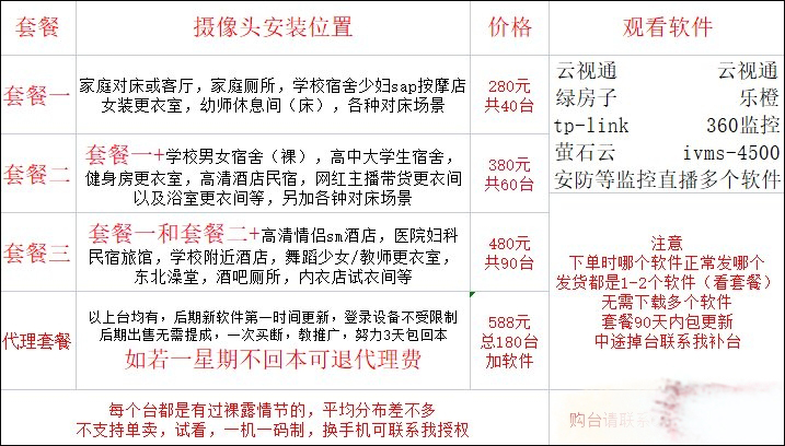 澎湃新聞記者以買家身份向該賣家諮詢,對方稱,因微信賬號會被封,現在他只能通過推特和電報羣聊引流。他稱,花280元到480元可購買對應的“套餐”,通過對應的設備ID,用户便能實時監控他人卧室、廁所、按摩店、女更衣室、學校女宿舍、婦科檢查科室、情趣酒店、民宿等場所,觀看軟件包括雲視通、綠房子、樂橙、螢石雲、360監控。