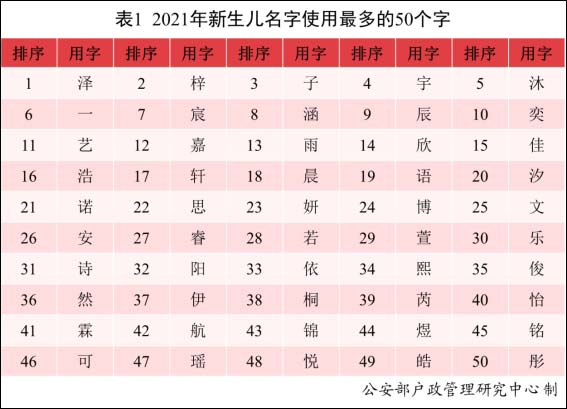 2021年出生並已經進行户籍登記的新生兒名字中,使用頻率最高的50個字依次為澤、梓、子、宇、沐等。與2020年相比,汐、芮、霖、航等字受到青睞。