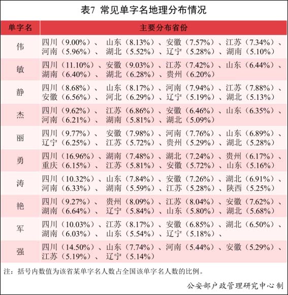 全國使用最多的10個單字名相對集中分佈在四川、山東、安徽、河南、江蘇、湖北、湖南、遼寧等省份。此外,還有6.20%的“敏”、5.29%的“麗”、6.17%的“勇”、8.09%的“豔”分佈在貴州;6.29%的“靜”分佈在河北;6.15%的“勇”分佈在重慶;5.25%的“濤”分佈在陝西。
