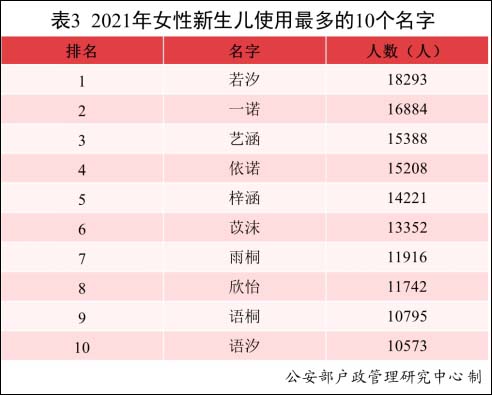 2021年出生並已經進行户籍登記的女性新生兒中,使用頻率最高的10個名字依次為:若汐、一諾、藝涵、依諾、梓涵、苡沫、雨桐、欣怡、語桐、語汐。與2020年相比,若汐、藝涵、苡沫首次進入前十,其中“若汐”使用人數達到1.8萬,登頂榜首,成為女性新生兒名字首選。