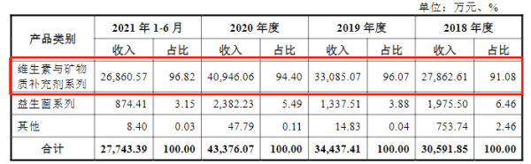 上述同期,21金維他系列產品分別實現營收2.79億元,3.31億元、4.09億元、2.69億元,佔總營收的91.08%、96.07%、94.4%、96.82%;益生菌系列產品分別營收1975.5萬元、1337.51億元、2382.23萬元、874.41萬元,僅佔總營收的6.46%、3.88%、5.49%、3.15%。