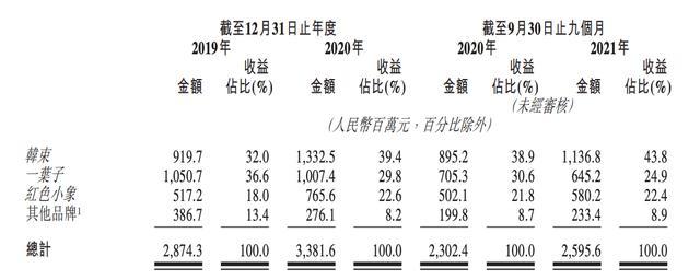從品牌劃分上看,“韓束”分別貢獻銷售額9.20億元、13.33億元及11.37億元;“一葉子”貢獻10.51億元、10.07億元及6.45億元;“紅色小象”貢獻5.17億元、7.66億元及5.80億元。三個品牌合計貢獻公司總收益的86.6%、91.8%及91.1%,為公司主要收入來源。