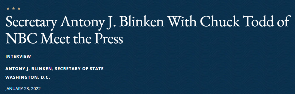 根據美國國務院網站消息,當地時間23日,布林肯接受NBC節目《面對媒體》採訪,就俄烏局勢最新進展回答記者提問。他表示,美國和歐洲盟國正為烏克蘭建立防禦、並試圖通過外交和對話解決分歧。