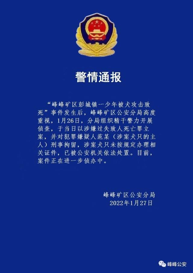1月27日,峯峯礦區公安分局官方微信公眾號發佈《警情通報》稱,“峯峯礦區彭城鎮一少年被犬攻擊致死”事件發生後,峯峯礦區公安分局高度重視,1月26日,分局組織精幹警力開展偵查,於當日以涉嫌過失致人死亡罪立案,並對犯罪嫌疑人範某(涉案犬隻的主人)刑事拘留,涉案犬隻未按規定辦理相關證件,已被公安機關依法處置。目前,案件正在進一步偵辦中。