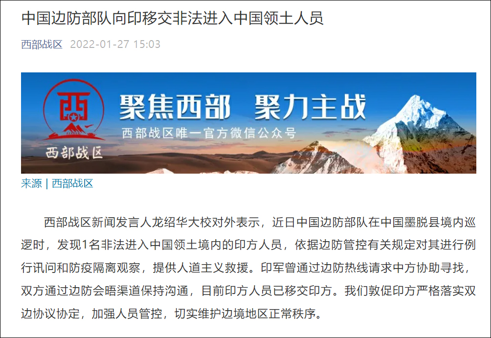 一名印方人員非法進入中國領土,我邊防部隊已移交