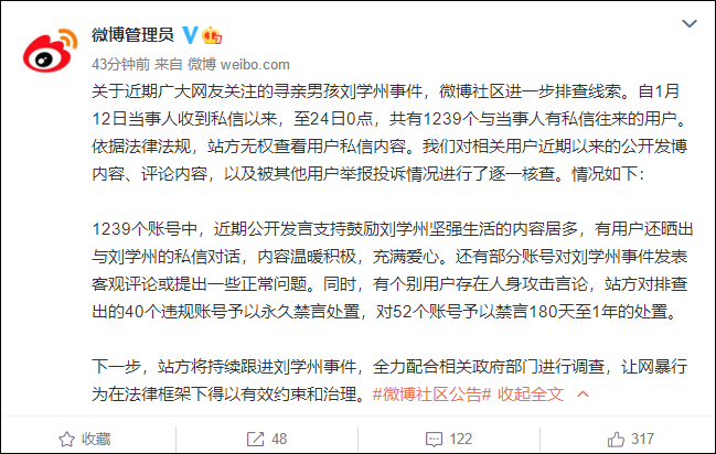 新浪微博社區管理官方微博(@微博管理員 )1月28日消息,關於近期廣大網友關注的尋親男孩劉學州事件,微博社區進一步排查線索。自1月12日當事人收到私信以來,至24日0點,共有1239個與當事人有私信往來的用户。依據法律法規,站方無權查看用户私信內容。我們對相關用户近期以來的公開發博內容、評論內容,以及被其他用户舉報投訴情況進行了逐一核查。情況如下:
