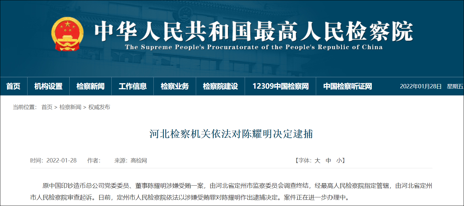 據最高人民檢察院28日消息,原中國印鈔造幣總公司黨委委員、董事陳耀明涉嫌受賄一案,由河北省定州市監察委員會調查終結,經最高人民檢察院指定管轄,由河北省定州市人民檢察院審查起訴。日前,定州市人民檢察院依法以涉嫌受賄罪對陳耀明作出逮捕決定。案件正在進一步辦理中。