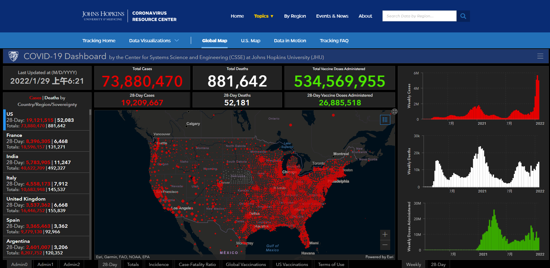 (觀察者網訊)根據美國約翰斯·霍普金斯大學統計數據,截至北京時間2022年1月29日6時21分,美國新冠肺炎累計確診病例達到73880470例,累計死亡病例達到881642例。在過去約24小時裏,美國新增確診病例522567例,新增死亡病例3514例。