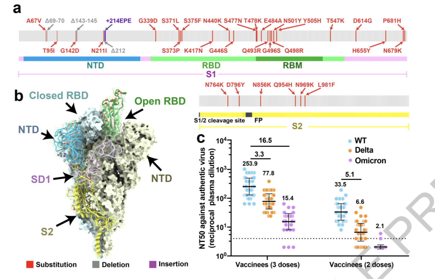 然而,他們在研究中提到,目前更值得關注的是兩劑接種方案對奧密克戎感染的有效性。在兩劑接種組中,與野生型(WT)病毒相比,對德爾塔的NT50滴度為6.6,降低5.1倍。值得注意的是,60名志願者中沒有血清樣本對奧密克戎的NT50滴度大於8。