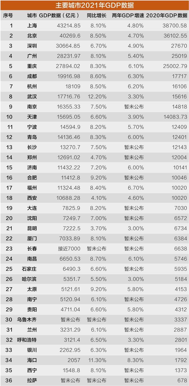 截至1月29日,全國36個主要城市(含4個直轄市、22個省會城市、5個自治區首府城市以及5個計劃單列市)中,除烏魯木齊和拉薩外,均已公佈了2021年GDP數據。