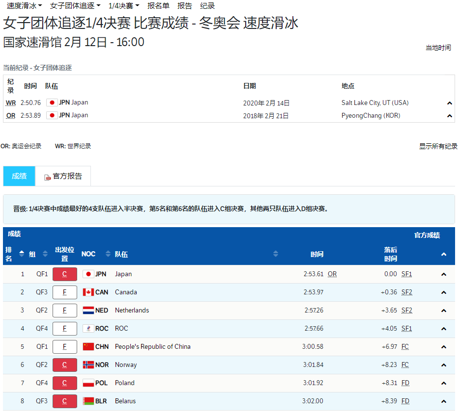 日本隊以2分53秒61的成績打破冬奧會紀錄,排名第一晉級半決賽。加拿大隊、荷蘭隊、俄羅斯奧委會隊分別排名二至四名,也晉級了半決賽。