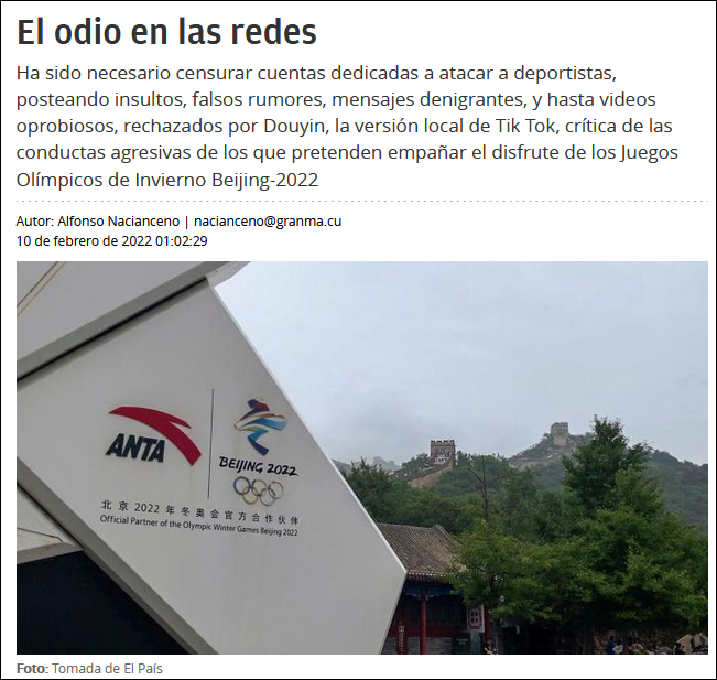 古巴共產黨中央委員會機關報《格拉瑪報(Granma)》10日發表文章,抨擊了美國政府等對北京冬奧會的指責。報道寫到,白宮聲稱抵制冬奧會的言論充滿了“煽動仇恨和美國實用主義色彩”,但實際上美國人知道這次冬奧會會像2008年夏季奧運會一樣成功。