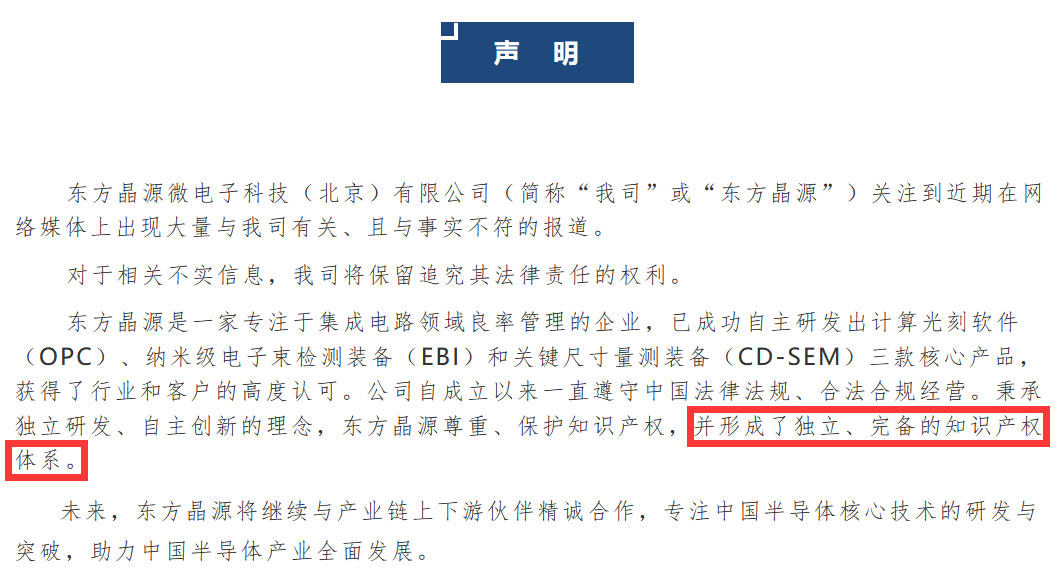2月11日晚間,針對“阿斯麥稱東方晶源可能侵權”一事,東方晶源發佈官方聲明稱,近期網絡媒體上出現大量與該公司有關且與事實不符的報道,對於相關不實信息,東方晶源將保留追究其法律責任的權利。聲明同時稱,東方晶源自成立以來一直遵守中國法律法規、合法合規經營。秉承獨立研發、自主創新的理念,東方晶源尊重、保護知識產權,並形成了獨立、完備的知識產權體系。