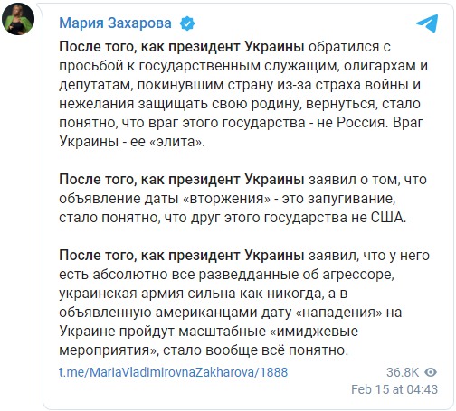 在澤連斯基呼籲公務員回國後,俄羅斯外交部發言人扎哈羅娃14日在社交媒體上評論稱:“烏克蘭政府要求那些因害怕戰爭和不願保衞祖國而離開該國的公務員、寡頭和議員回國後,這個國家的敵人顯然不是俄羅斯,而是那些‘精英’”。她還稱,“在澤連斯基表示,宣佈“入侵”日期是一種恐嚇之後,很明顯,美國不是這個國家的朋友。”