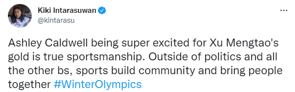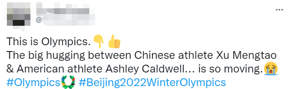 一名美媒NBC的亞裔記者看到這一幕後,在個人社交媒體上寫道:兩人的擁抱體現了真正的體育精神,體育,而不是政治或者其他,讓人們真正走在了一起。
